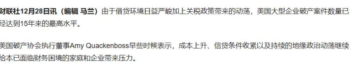 现时好意思国假贷环境日益严峻,企业资金链开动贫寒,关税策略带来的荡漾进一步冲击企业生涯环境。